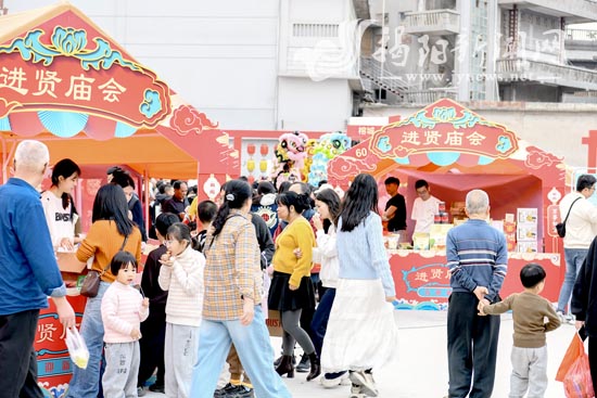 百货大楼附近的进贤庙会同样人气高涨。反沙咸蛋黄、大洋苦笋、鹅肉丸、天鹅湖橄榄、油柑汁、祥记猪肉脯、普宁梅酒等40多家企业近100个农产品、20多家单位带来的30多个非遗产品、老字号商品集中亮相,将地道风味、传统技艺与新春年味融为一体,进贤庙会也成为市民游客逛吃打卡、感受本土文化的热门打卡点。