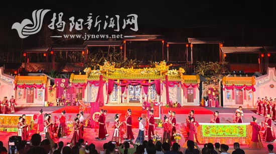 当晚,仪式现场充满了热烈喜庆的氛围,不仅让传统婚俗焕发新生,更以“家国同庆”的宏大叙事,为这个国庆中秋假期增添了浓厚的人文暖意。大型实景演出《英歌情》的演员们献上精彩纷呈的表演,不仅为新人送上诚挚祝福,更将现场热烈喜庆的氛围一次次推向高潮,让全场观众沉浸式领略到潮汕传统非物质文化遗产的独特魅力,也让传统婚俗在军旅场景中焕发全新生机。驻普某部队、普宁市双拥办、退役军人事务局、爱国拥军促进会有关领导和社会各界人士出席活动。